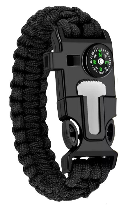 Brățară țesută din paracord, cu busolă, fluier și vârf – brichetă din magneziu.