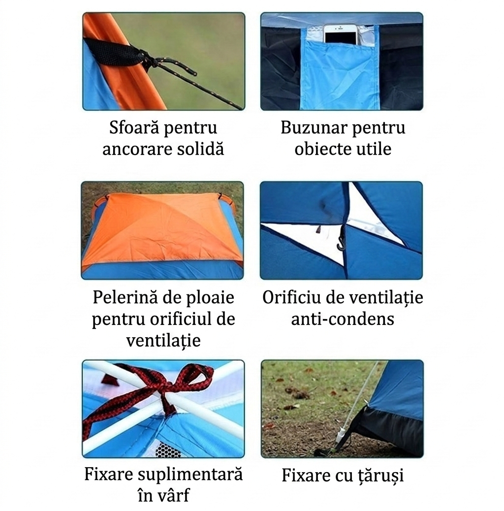 Pur și simplu scoateți cortul din cutie, desfaceți clemele și aruncați-l în aer lângă dumneavoastră. Se va extinde automat și tot ce mai rămâne de făcut este să îl fixați cu cuie de pământ pentru o stabilitate mai mare.